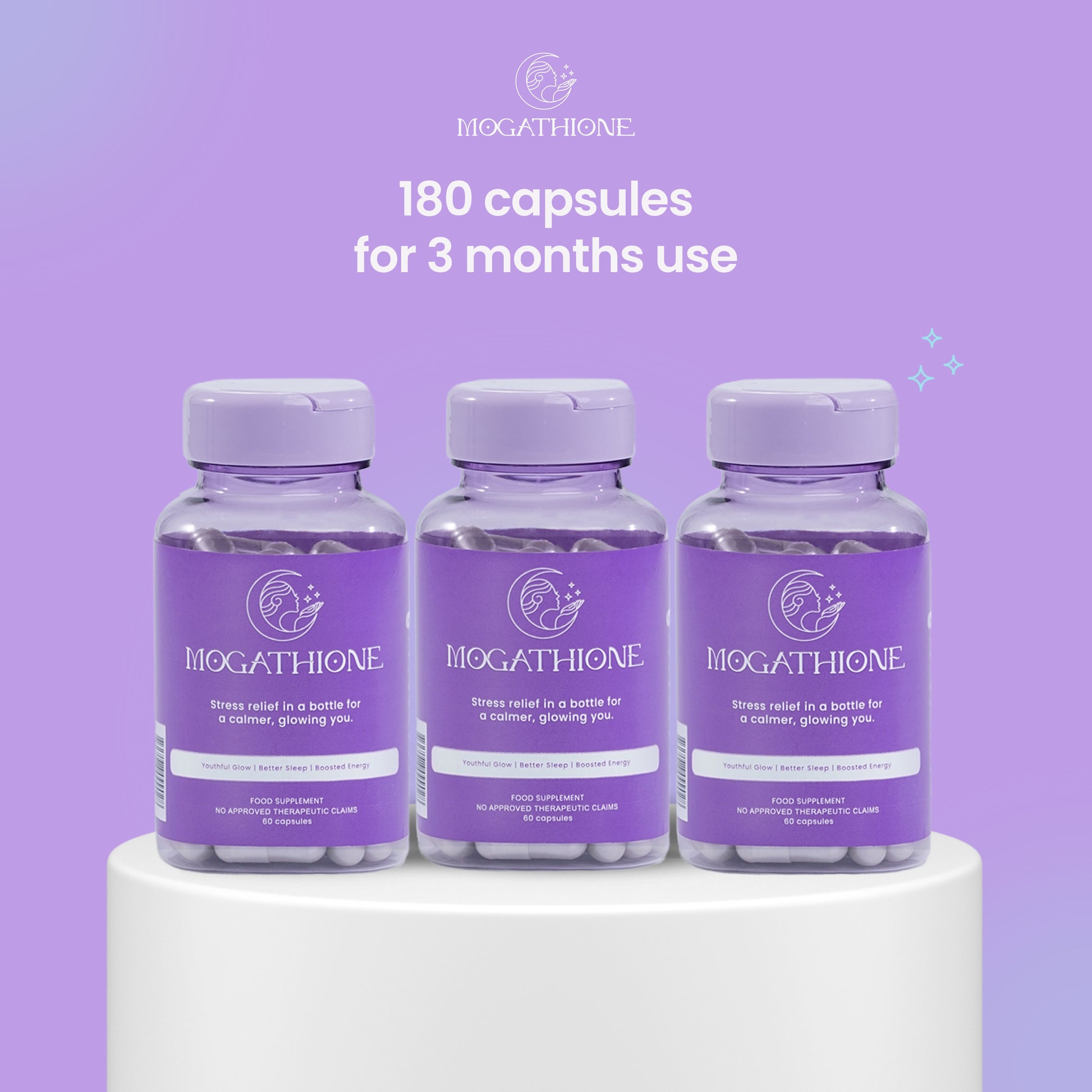 Mogathione supplement offers a comprehensive approach to stress relief, better sleep, increased energy, whitened skin, and overall well-being.